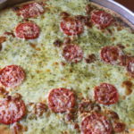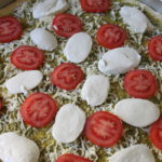 Απλώστε την σάλτσα pesto και πασπαλίστε με τη μισή τριμμένη μοτσαρέλα προσθέστε τις φέτες ντομάτας και τις φέτες της φρέσκιας μοτσαρέλας. Πασπαλίστε με την υπόλοιπη μοτσαρέλα και το πεκορίνο και ψήστε την πίτσα για περίπου 15 λεπτά ή μέχρι να πάρει ένα χρυσαφί χρώμα.