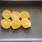 Arrange 6 orange slices in the roasting pan and place duck, breast side up, on them. Place rest of oranges into the cavity of the duck.
