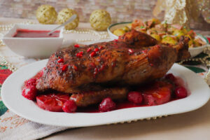Place the roasting pan in the oven and roast the duck for 1 ½ hour. After 1 ½ hour, increase the oven setting to 200°C/ 390℉ and cook for additional 30 minutes. Remove duck from oven and allow to rest 10 -15 minutes.