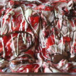 Place 1/3 of chocolate ice cream into a bowl with lid. Spoon 1/3 of strawberry sauce with a teaspoon over the ice cream leaving areas of ice cream uncovered. Spoon 1/3 of the melted, white chocolate and melted semi-sweet chocolate over strawberry sauce in a swirled pattern. Repeat the layering with another third of the ice cream, strawberry sauce, and chocolates. Repeat again and end with a final layer of strawberry sauce and chocolates.