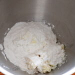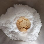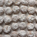 In a large mixing bowl, either using an electric hand mixer or stand mixer beat butter or goat butter, shortening and powdered sugar until light and fluffy. Add the ouzo or vodka, almond and vanilla extract and mix well. Add flour and almonds into creamed mixture and mix until soft crumbly dough is formed. Don’t over mix them.