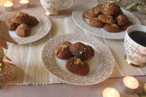 Then, while the cookies are still very warm, float them in the syrup a few at a time, turning them over to make sure they soak up plenty of liquid. After about 10-15 seconds, take the cookies out with a fork or spoon with holes in, put them on a serving plate and sprinkle them with the walnut/cinnamon mixture.