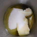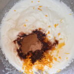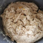 In a separate bowl, with an electric mixer beat together olive oil, shortening and sugar for 5-6 minutes on high speed until it turns white. Then add brandy, orange juice, orange zest, vanilla extract and spices and mix, until well blended.  Add the flour to the shortening-olive oil mixture and knead until a stiff, wet dough forms. Don’t over mix it. If you mix too long the mixture will split.