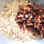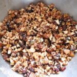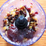 Place raisins, dried raspberries, brandy, candied citrus and jam in a food processor and mix until well blend. Add dried fruits to chopped nut and mix well. Set aside.