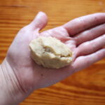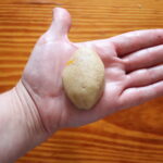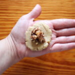 Shape the mixture into cookies sized 3-4 cm in diameter. Pick up cookie dough, spread it in your hand, add 1 teaspoon of the filling, close the dough around the filling and create an oval shape.