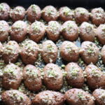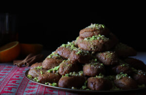 After about 10-15 seconds, take the cookies out with a fork or spoon with holes in, put them on a serving plate and drizzle with honey and sprinkle with walnuts and pistachios.