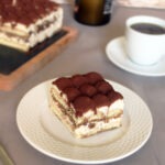 Using the coarse side of a grater, grate the chocolate over the cream. Repeat with another layer of soaked ladyfingers and then top with the remaining mascarpone mixture.