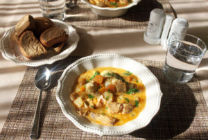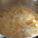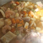 Turn up the heat to medium-high.  Add the fish variety, shrimps and bacon to the pot, cover and continue cooking for 5 more minutes.