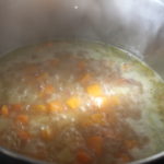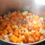 Heat the oil and butter in a large pot, tip in the onions and sauté for 5 minutes over medium heat.  Add the potatoes, sweet potato, carrot and butternut squash and cook for 2 more minutes.